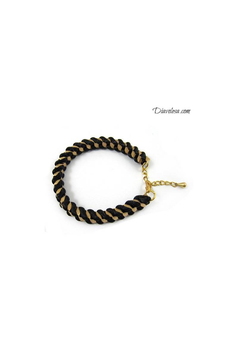 Aukso spalvos apyrankė, apipinta švelniais siūlais.