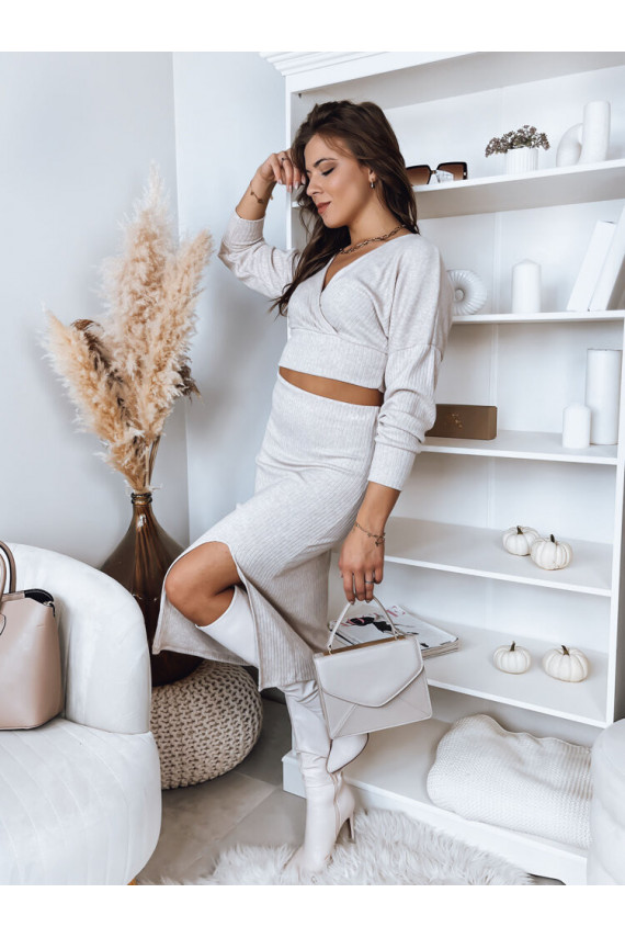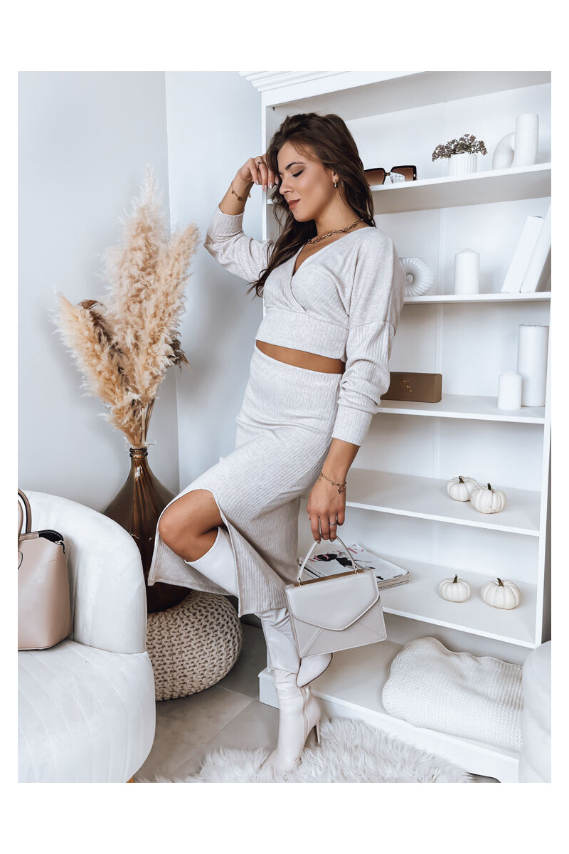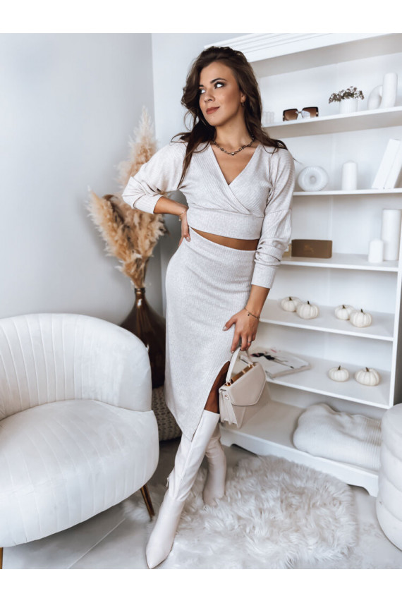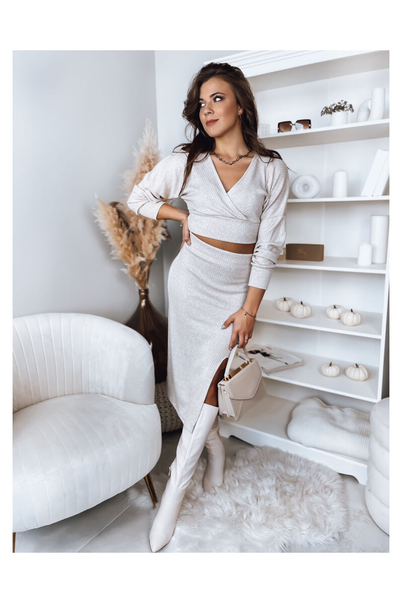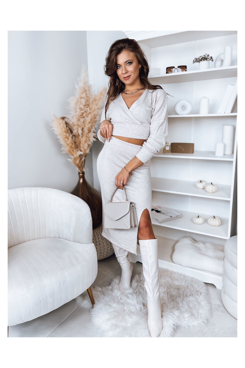 Komplekts , kas sastāv no midi svārkiem un īsākas augšdaļas, ir piedāvājums, kas palīdzēs jums izcelties no pūļa. Svārkiem ir elastīga jostasvieta un uzkrītošs šķēlums. Top tipa blūze ir nedaudz pārāk liels griezums.