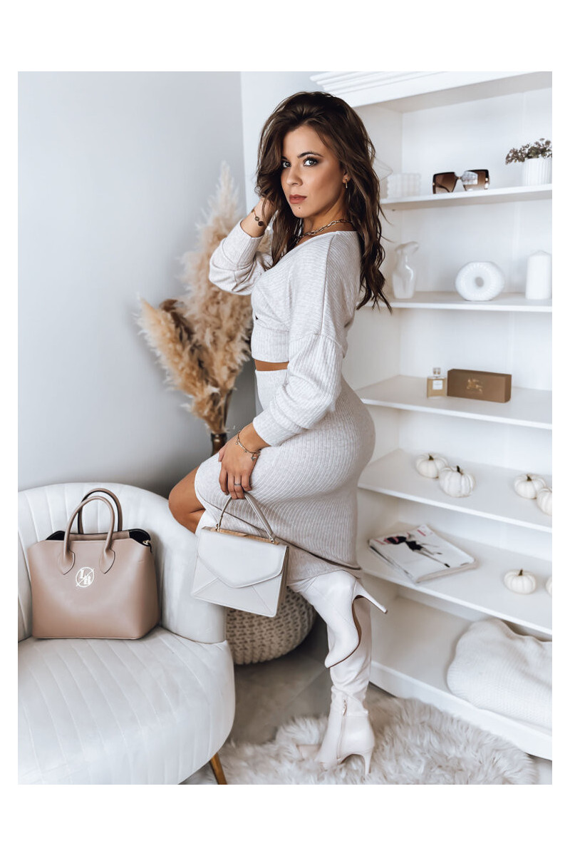 Komplekts , kas sastāv no pieguļošiem midi svārkiem un īsākas augšdaļas, ir piedāvājums, kas palīdzēs jums izcelties no pūļa. Svārkiem ir elastīgs viduklis un uzkrītošs šķēlums, un tie lieliski pieguļ figūrai. Top tipa blūze raksturīgs nedaudz oversize piegriezums un skaists kroku izgriezums. Visa lieta ir izgatavota no augstas kvalitātes materiāla. Valkā kopā vai atsevišķi.