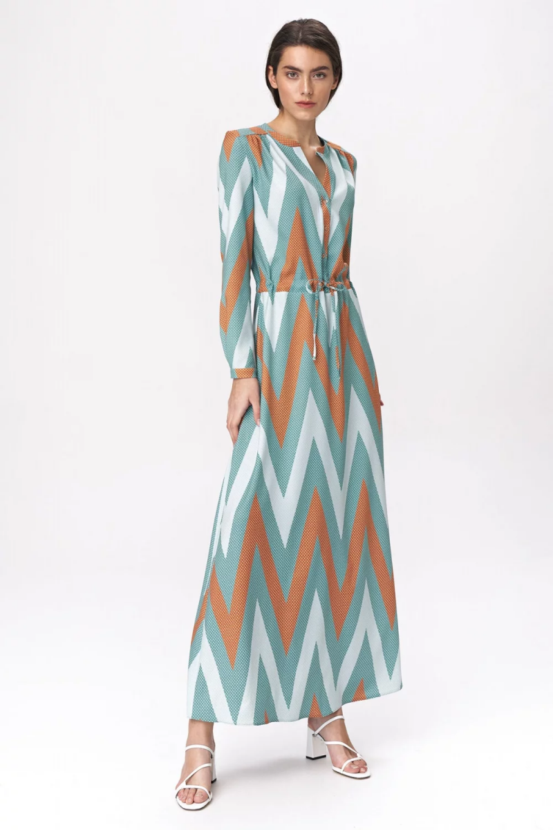 Turquoise maxi Kleita with fashionable zigzag print is a great proposition for enthusiasts of feminine, romantic and boho stylizations. Combined with stiletto heels and a jacket, it can be an original soft-office alternative to classic office outfits.