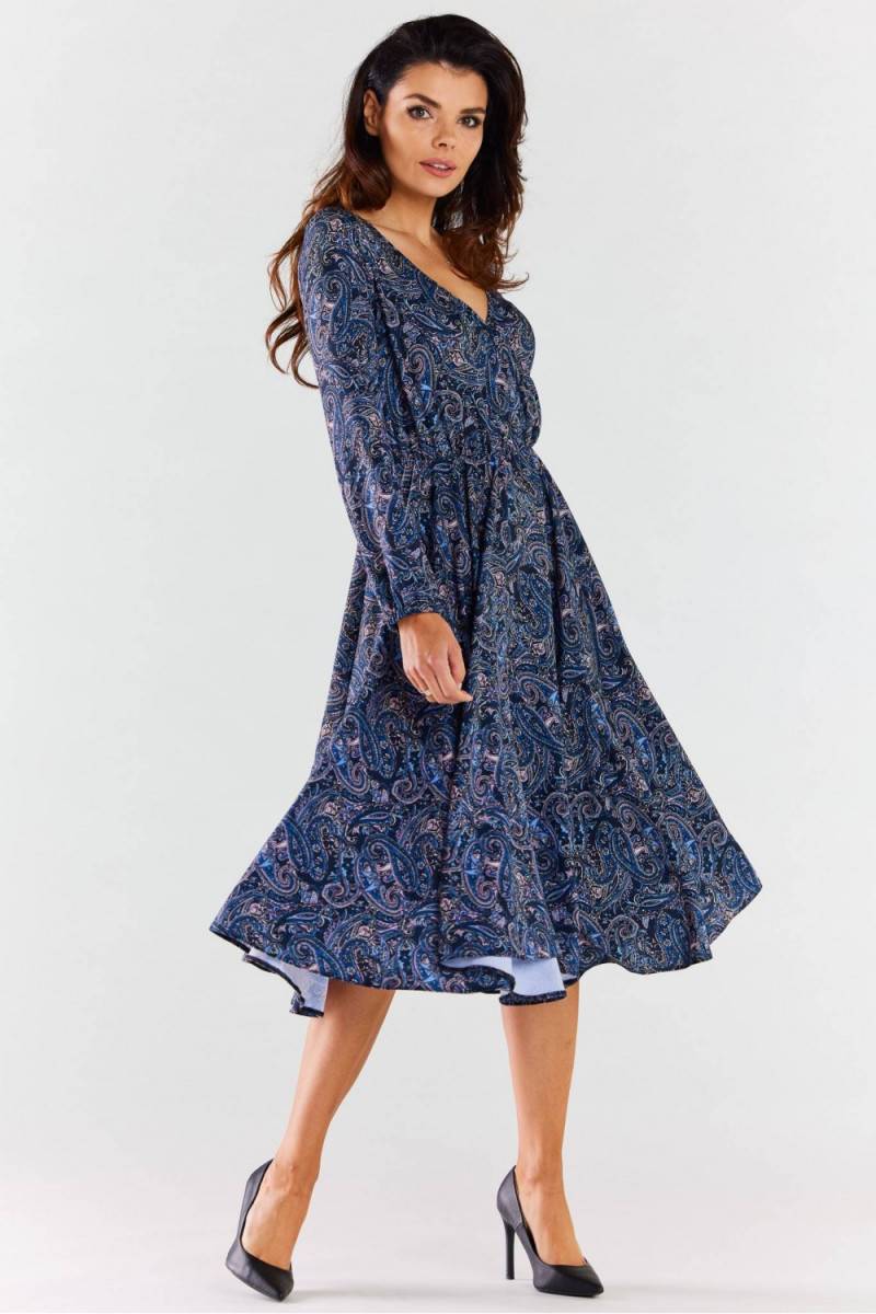 Midi Kleita with envelope neckline. Long sleeves and a flared hem. Elastic waistband provides a perfect fit to the body. Product made in Poland.