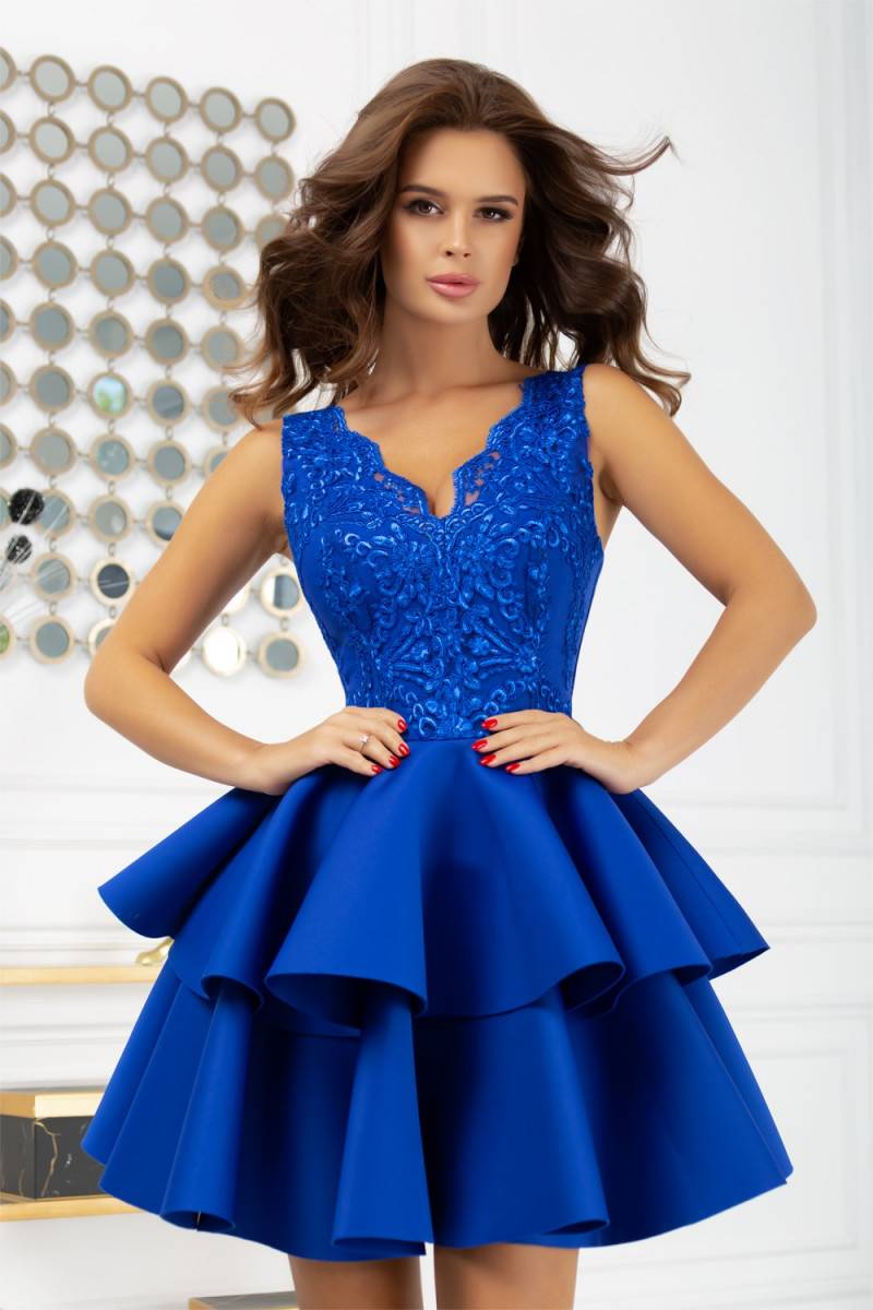 A feminine Kleita with two frills. The top is made of aesthetic lace that composes beautifully with the bottom. Back is built up, neckline is cut in the letter V. Kleita will satisfy the needs of the most demanding customers. Kleita zipped, has a lining. Available in tasteful colors.