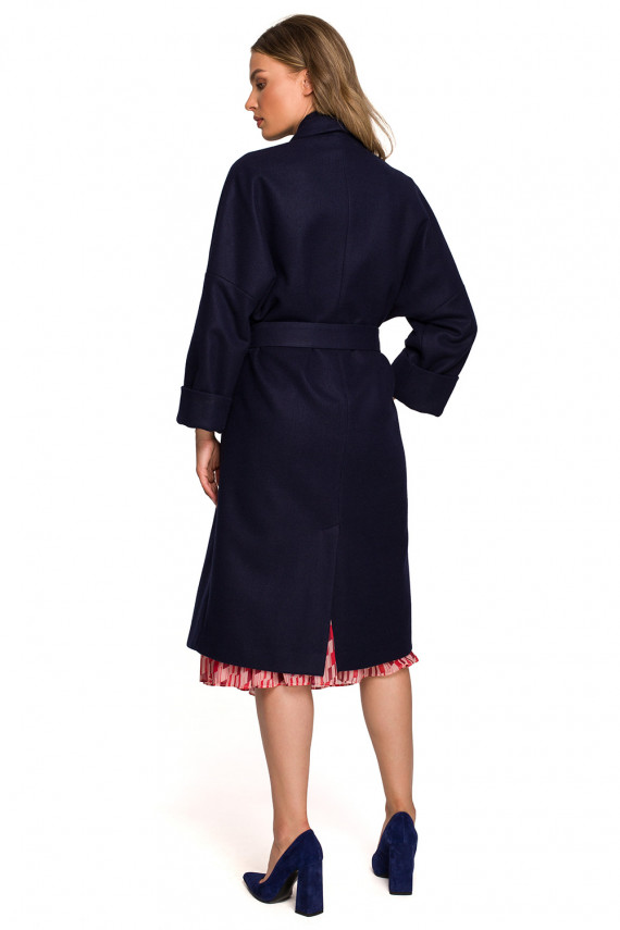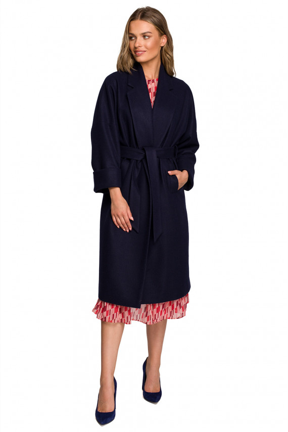 Autumn and winter weather is conducive to coats. We suggest a comfortable oversized cut with a collar, pockets on the front and wide sleeves with the possibility of turning up, as well as with a belt to tie. The coat is fully lined.