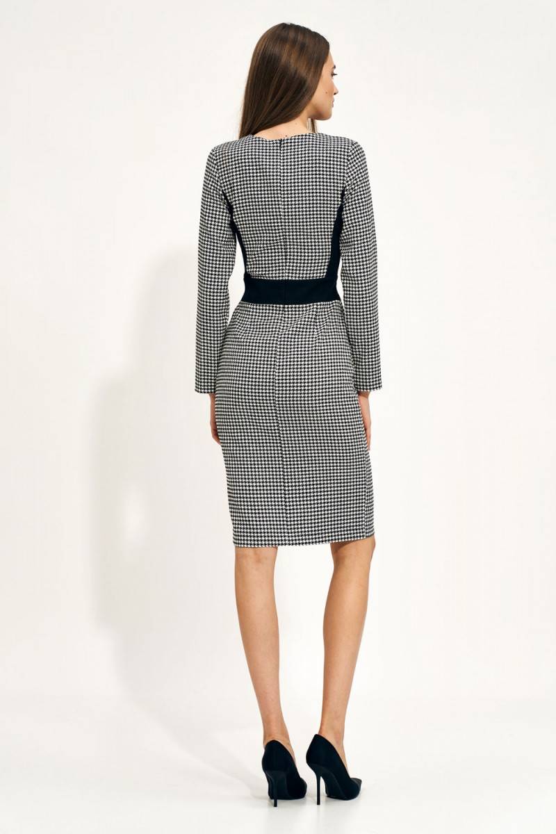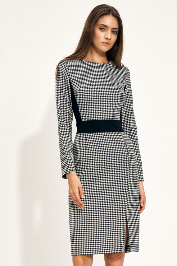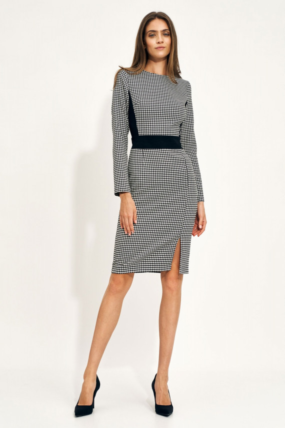 A softoffice style Kleita does not have to be boring at all! Just bet on a modern cut, timeless design. Thanks to the contrast embellishment, it slims the waist, emphasizes the bust and hips. On one side there is an eye-catching cutout, which further ensures freedom of movement. The Kleita is fastened with a covered zipper and has no lining.
