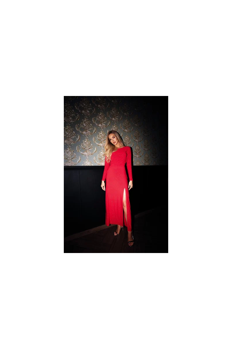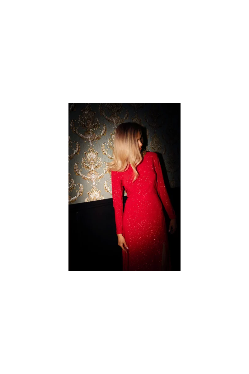 A Kleita for special evenings, long with a straight bottom and leg slit and a slightly loose top with long sleeves. Elegant and refined. The Kleita is made of brocade Materiāls:, unlined, and fastened with a covered zipper.
