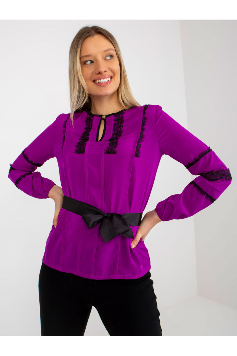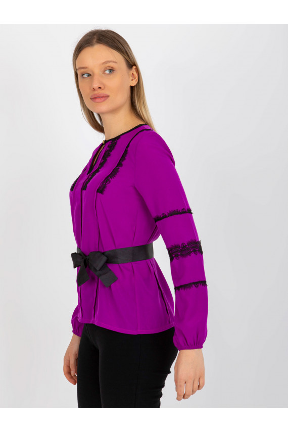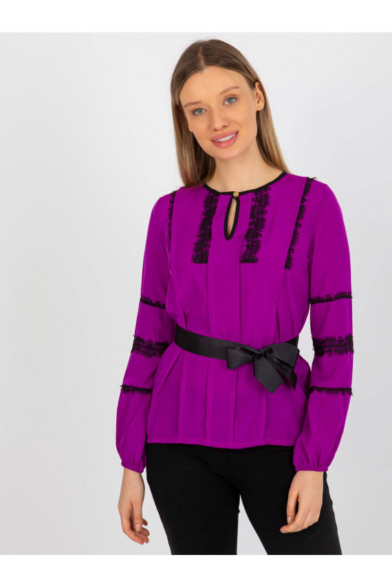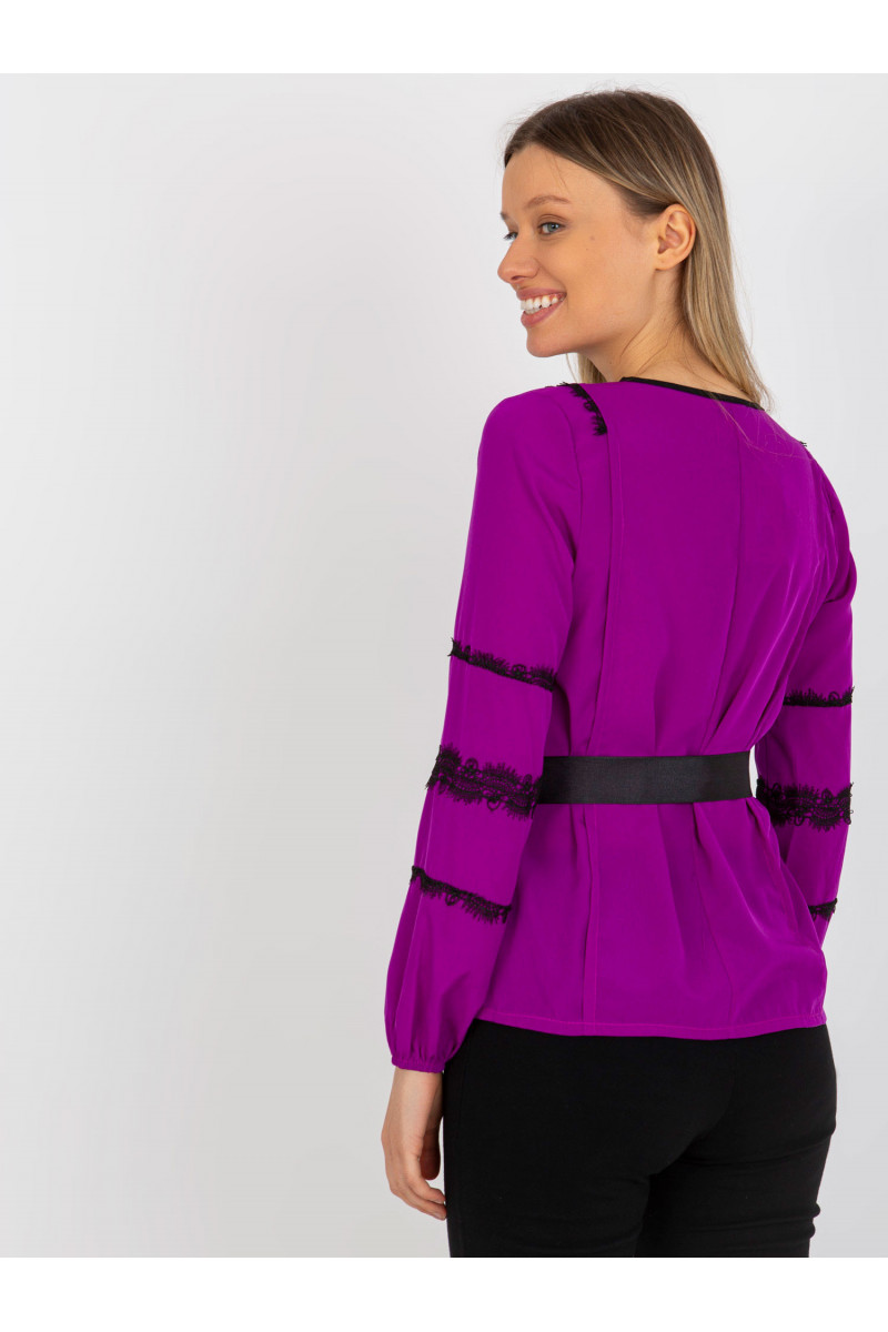 Purpura sieviešu svinīga blūze ar mežģīnēm un iesējumu.