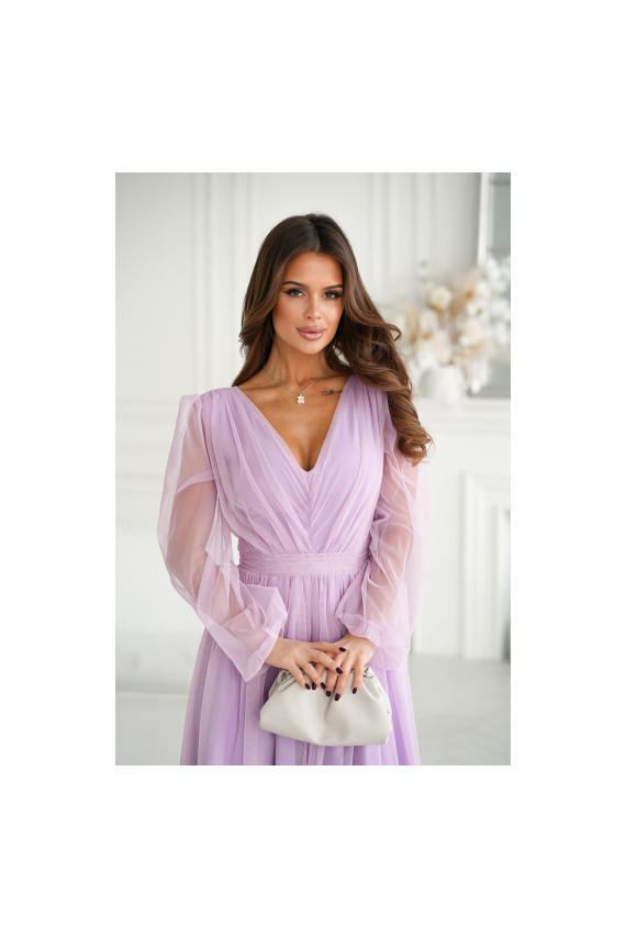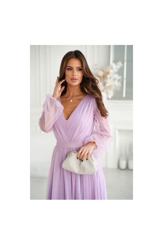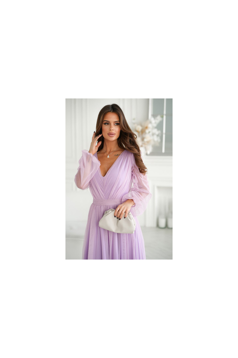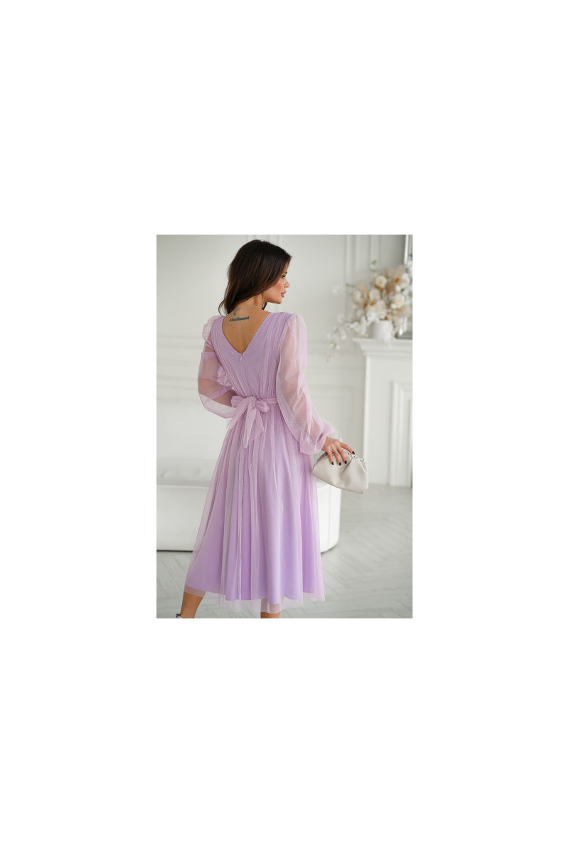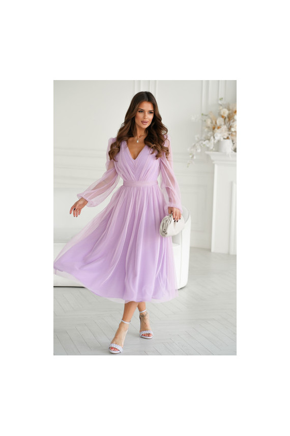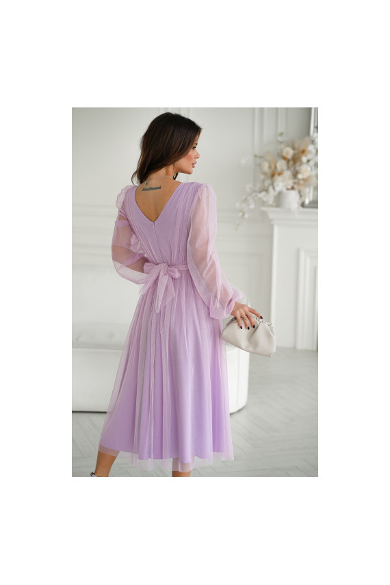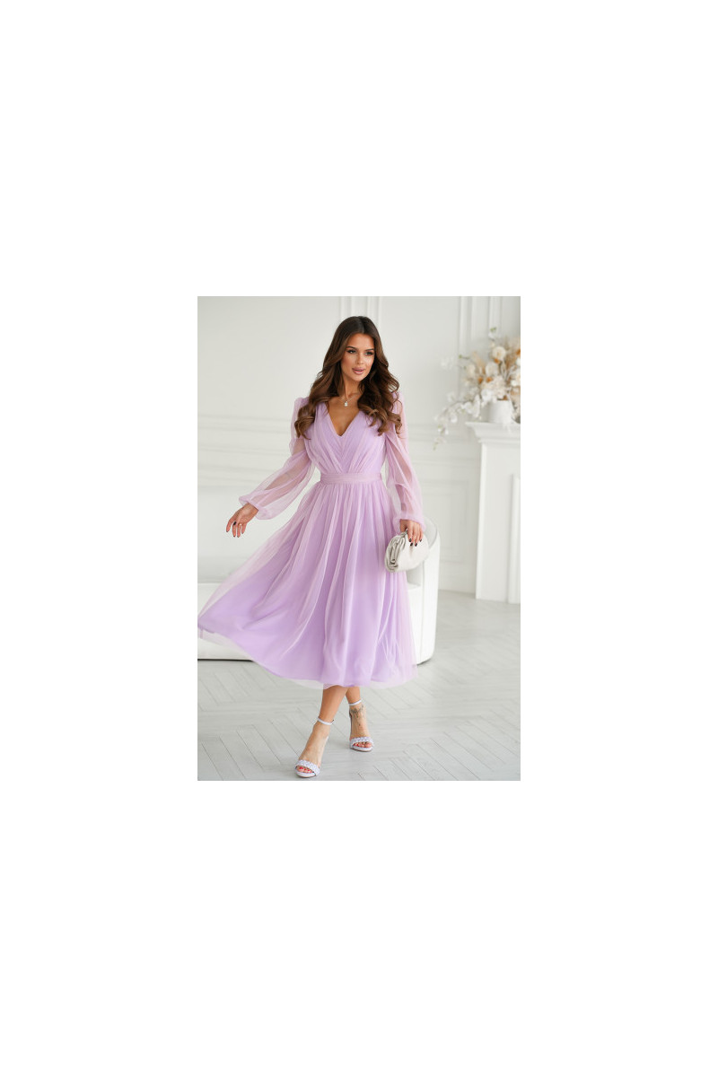 Midi kleita ar nedaudz uzplaucētiem slāņainiem svārkiem, kas apgriezti ar brokāta sietu. Radījuma augšdaļa ir krokota ar garām piedurknēm, kas apdarinātas ar gumiju. Piedurknes šūtas no tāda paša sieta kā pārējā kleita. Kleita ir oderēta un aiztaisāma ar vered zipper. Cheese-shaped neckline and back. Stilīgasl adding chic and femininity.