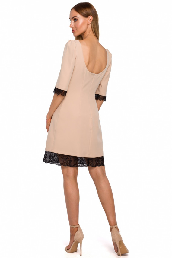 Romantiska kleita sievišķīga piegriezuma cienītājiem. Kleitas piedurknes un apakšējā līnija ir akcentēta ar smalkām mežģīnēm, savukārt skaistais ovālais kakla izgriezums skaisti izceļ muguras līniju. Kleita aiztaisāma ar pārsegtu rāvējslēdzēju. Mūžīga klehat will be suitable for any elegant occasions.