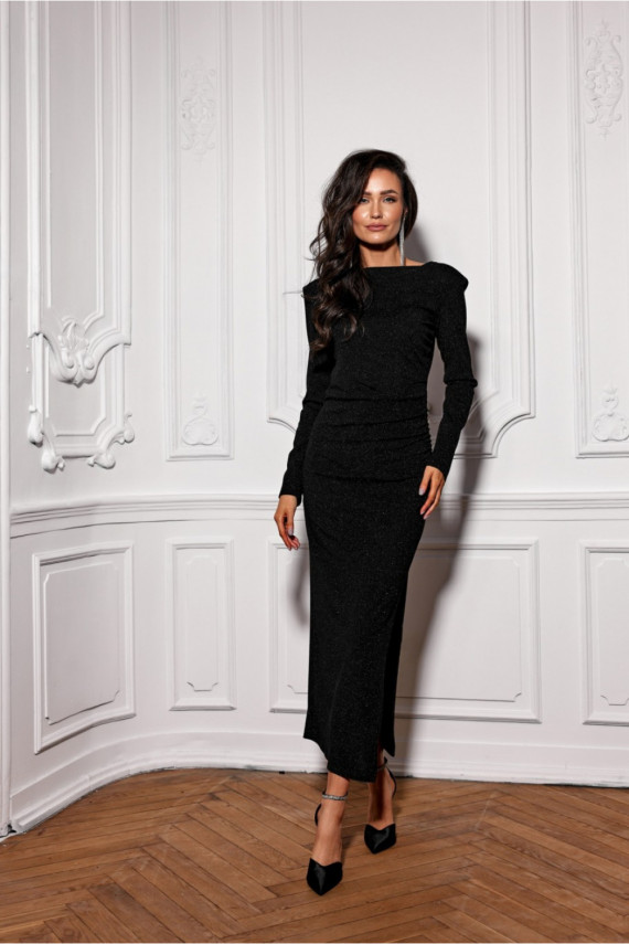 Kleita ir izgatavota no materiāla ar spīdīgiem akcentiem, kas skaisti mirdz gaismā. Elegants laivas kakla izgriezums smalki izceļ plecu līniju, piešķirot visam juteklisku raksturu. V veida kakla izgriezums kleitas aizmugurē piešķir tai īpašu šarmu un sievišķību. Uzkrītošā kāju šķēle ir galvenais elements, kas ne tikai padara siluetu slaidāku, bet arī nodrošina komfortu valkāšanas laikā. Ruching sānos smalki akcentē gurnu formu. Plecu spilventiņi piešķir kleitai mūsdienīgumu un struktūru, lieliski saplūstot ar modes tendencēm, vienlaikus izceļot plecus. Kleita ir elastīga un lieliski pieguļ siluetam, aptverot sievišķīgus izliekumus. Neatkarīgi no tā, vai plānojat vakaru pilsētā vai elegantu ballīti, šī kleita kļūs par jūsu iecienītāko garderobes detaļu. To ir viegli veidot, savienot ar elegantiem papēžu kurpēm un rotaslietām vai iegūt neformālu izskatu ar puszābakiem un nelielu ķēdes somu, lai izjauktu stilu. Produkts ražots un šūts Polijā.