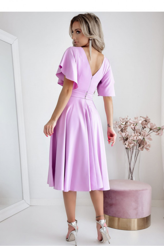 Elegantā ceriņu kleita ir lieliska izvēle īpašiem gadījumiem. Izgatavots no augstas kvalitātes materiāla, tas lieliski iederas siluetā, uzsverot tā īpašības. Tam ir V veida kakla izgriezums, kas smalki atklāj kaklu un atslēgas kaulus. Brīvas, volānās piedurknes piešķir Kleitai vieglumu un romantisku raksturu. Vidukli akcentē dekoratīva josta ar smalkiem rotājumiem, skaisti izceļot figūru. Paplašinātā apakšdaļa piešķir kleitai plūstošu un elegantu izskatu. Kleita ir aiztaisīta ar slēptu rāvējslēdzēju, nodrošinot komfortu un perfektu piegulšanu. Lieliski piemērots kāzām, pieņemšanām, kristībām un citiem elegantiem pasākumiem.