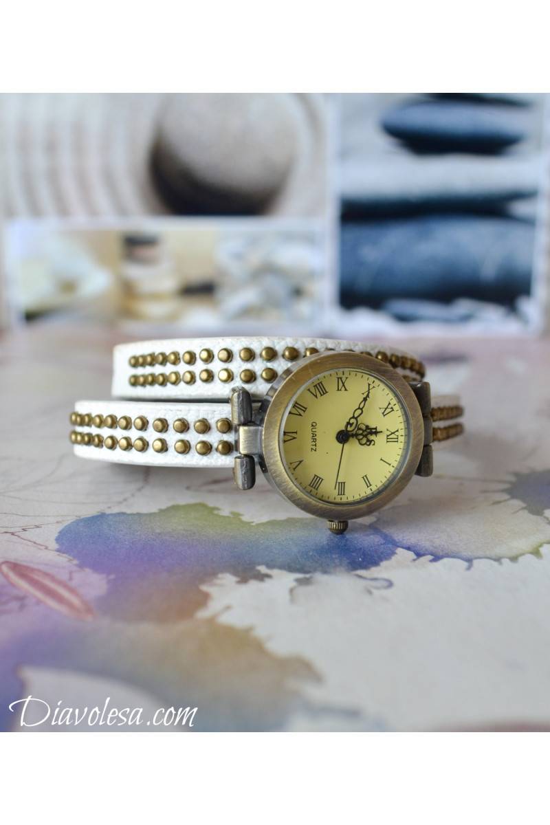 "Vintage" stiliaus laikrodis. Laikrodžio apyrankė labai ilga, nes laikrodis nešiojamas du kartus apvyniojus laikrodžio apyrankę aplink riešą. Laikrodžio apyrankė puošta bronzos spalvos miniatiūrinėmis kniedėmis. Aksesuaras pagamintas iš dirbtinės eko odos ir metalinių detalių. Laikrodis parduodamas su baterija viduje. Visas laikrodžio ilgis 43 cm, ciferblato skersmuo 2,6 cm.