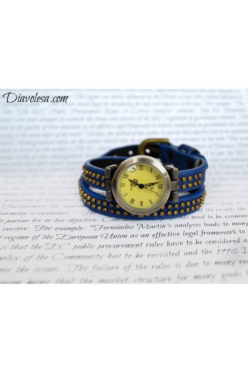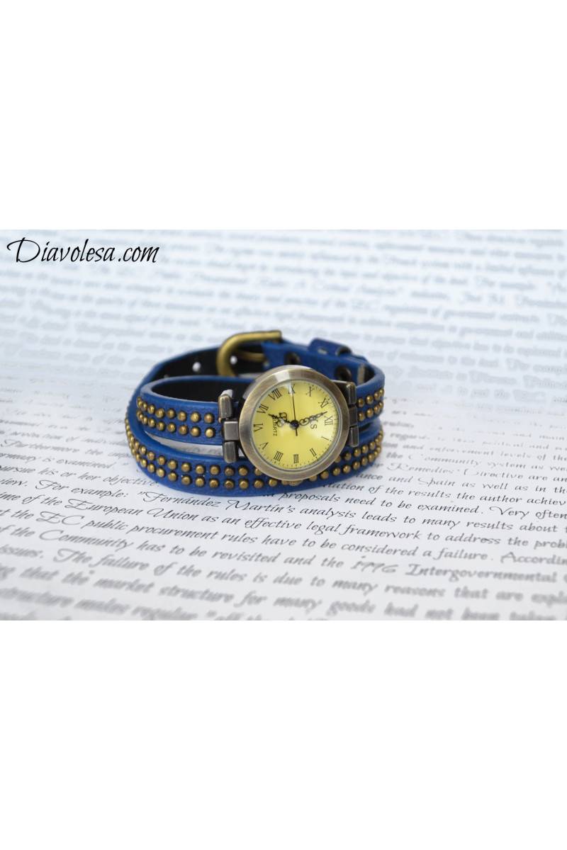 "Vintage" stiliaus laikrodis. Laikrodžio apyrankė labai ilga, nes laikrodis nešiojamas du kartus apvyniojus laikrodžio apyrankę aplink riešą. Laikrodžio apyrankė puošta bronzos spalvos miniatiūrinėmis kniedėmis. Aksesuaras pagamintas iš dirbtinės eko odos ir metalinių detalių. Laikrodis parduodamas su baterija viduje. Visas laikrodžio ilgis 43 cm, ciferblato skersmuo 2,6 cm.