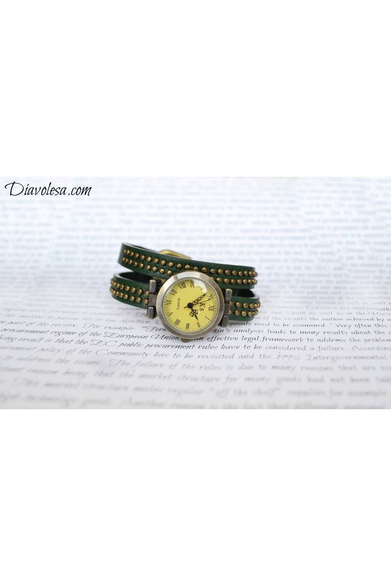 "Vintage" stiliaus laikrodis. Laikrodžio apyrankė labai ilga, nes laikrodis nešiojamas du kartus apvyniojus laikrodžio apyrankę aplink riešą. Laikrodžio apyrankė puošta bronzos spalvos miniatiūrinėmis kniedėmis. Aksesuaras pagamintas iš dirbtinės eko odos ir metalinių detalių. Laikrodis parduodamas su baterija viduje. Visas laikrodžio ilgis 43 cm, ciferblato skersmuo 2,6 cm.